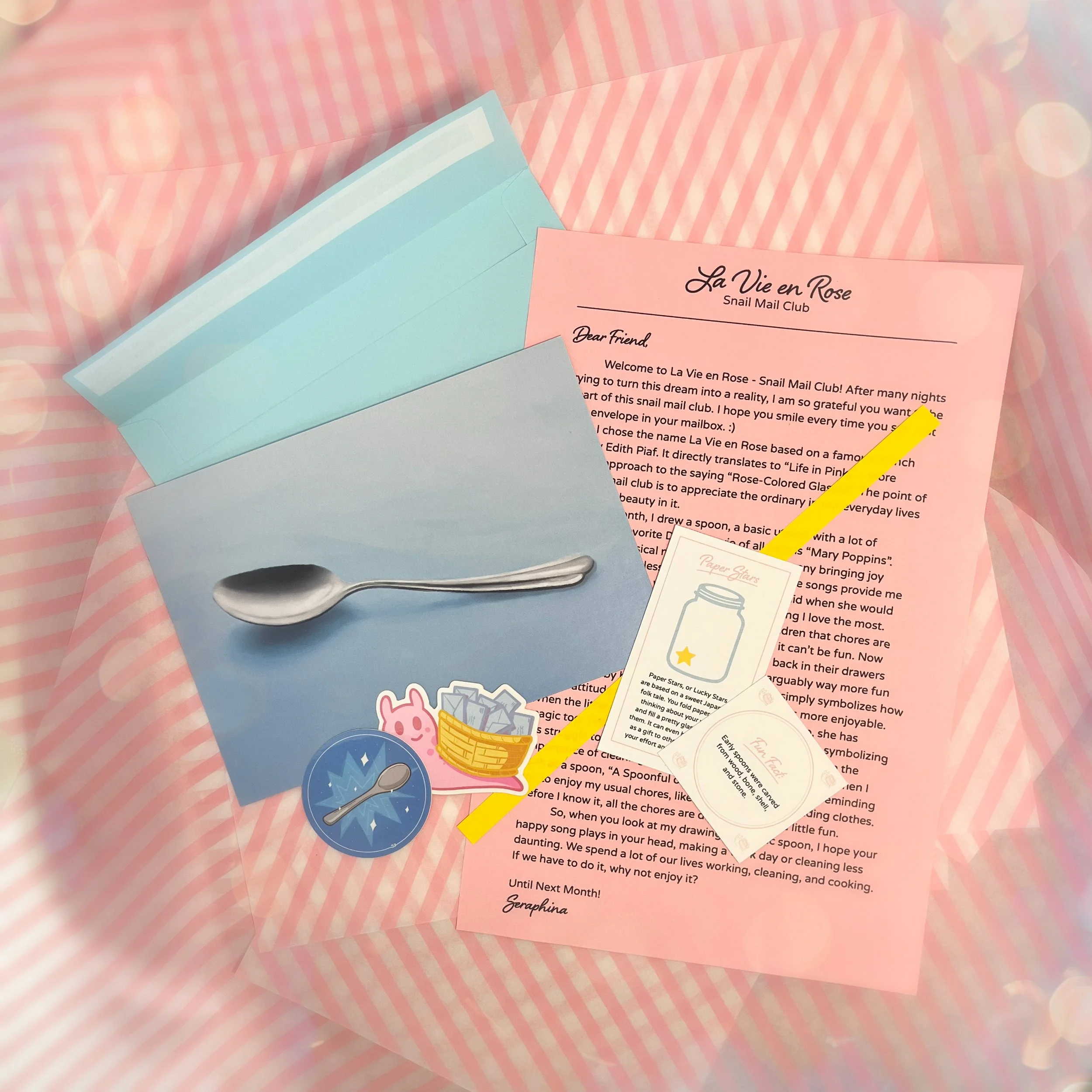 Named after my favorite French song, “La Vie en Rose” by Edith Piaf, this snail mail club strives to help you appreciate the ordinary. Each month, I look at my life with rose-colored glasses and pick an everyday object to draw. I then create a matching sticker, fun fact card, reflect on my art, and mail it to you!